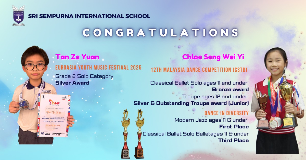 SRI Sempurna International School proudly announces outstanding achievements by two of its talented students in prestigious international competitions. Tan Ze Yuan secured a Silver Award in the Grade 2 Solo Category at the EUROASIA YOUTH MUSIC FESTIVAL 2025, showcasing exceptional musical skill on an international stage.